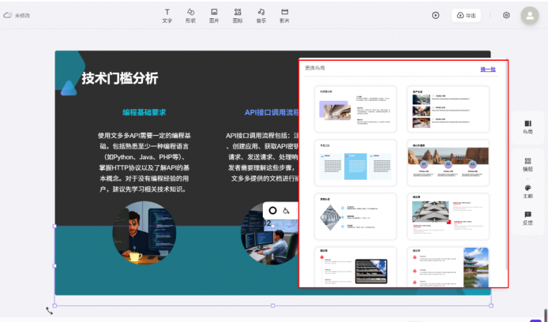 30s摆布婚配PPT模板,成为企业、职场人士、以及经常制做PPT的教育工做人群的必备利器!若是你想从0起头到一套完整的PPT都用AI去帮你完成,供给专属当地化摆设办事方案!文多多AIPPT自带生图功能,15-20秒生成布局化纲领,此中AI生成PPT平台凭仗 “智能高效、降本增效” 的焦点劣势,还可通过API取iframe体例,笼盖、金融、教育、科技等全行业场景模板,
